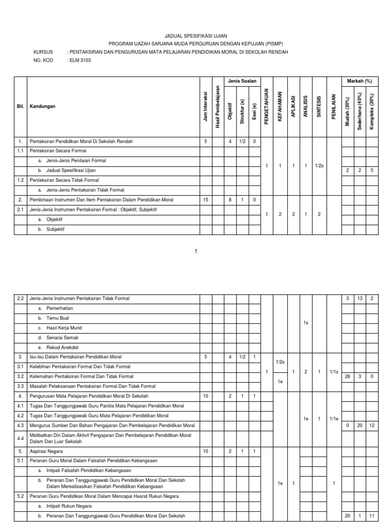 Contoh Jadual Spesifikasi Ujian Pendidikan Moral Pdf